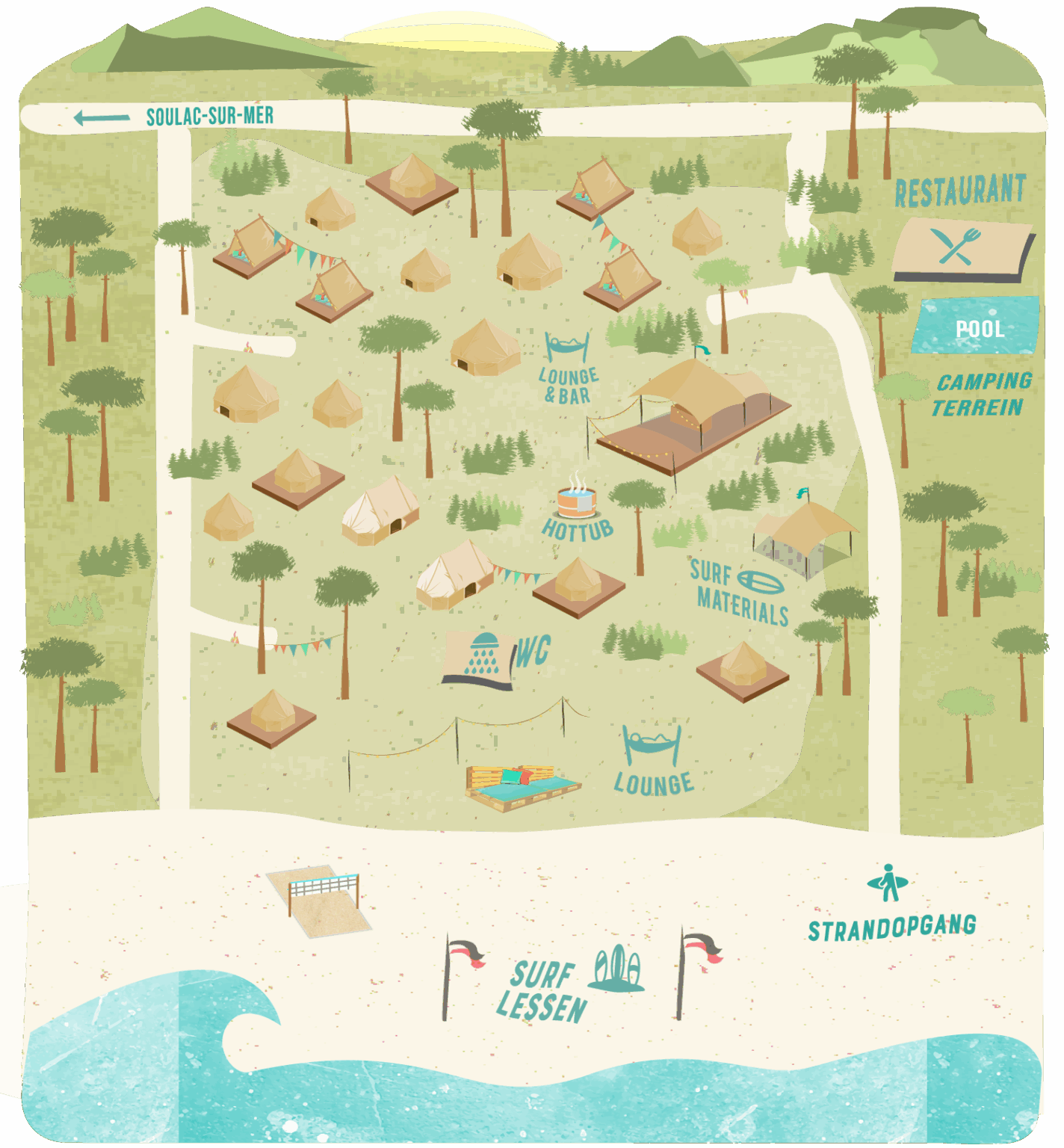 Het Enter The Wave terrein ligt direct op de duin van Soulac-sur-Mer, vanaf waar je binnen een paar minuten met je surfboard in het water ligt. Alle tenten op het Forestcamp zijn luxe ingericht met comfortabele bedden, meubilair en elektriciteit. Naast een prachtig strand biedt het dorpje de mogelijkheid om ‘s avonds uitgebreid te eten of de lokale kroegjes en surfbars te bezoeken.
