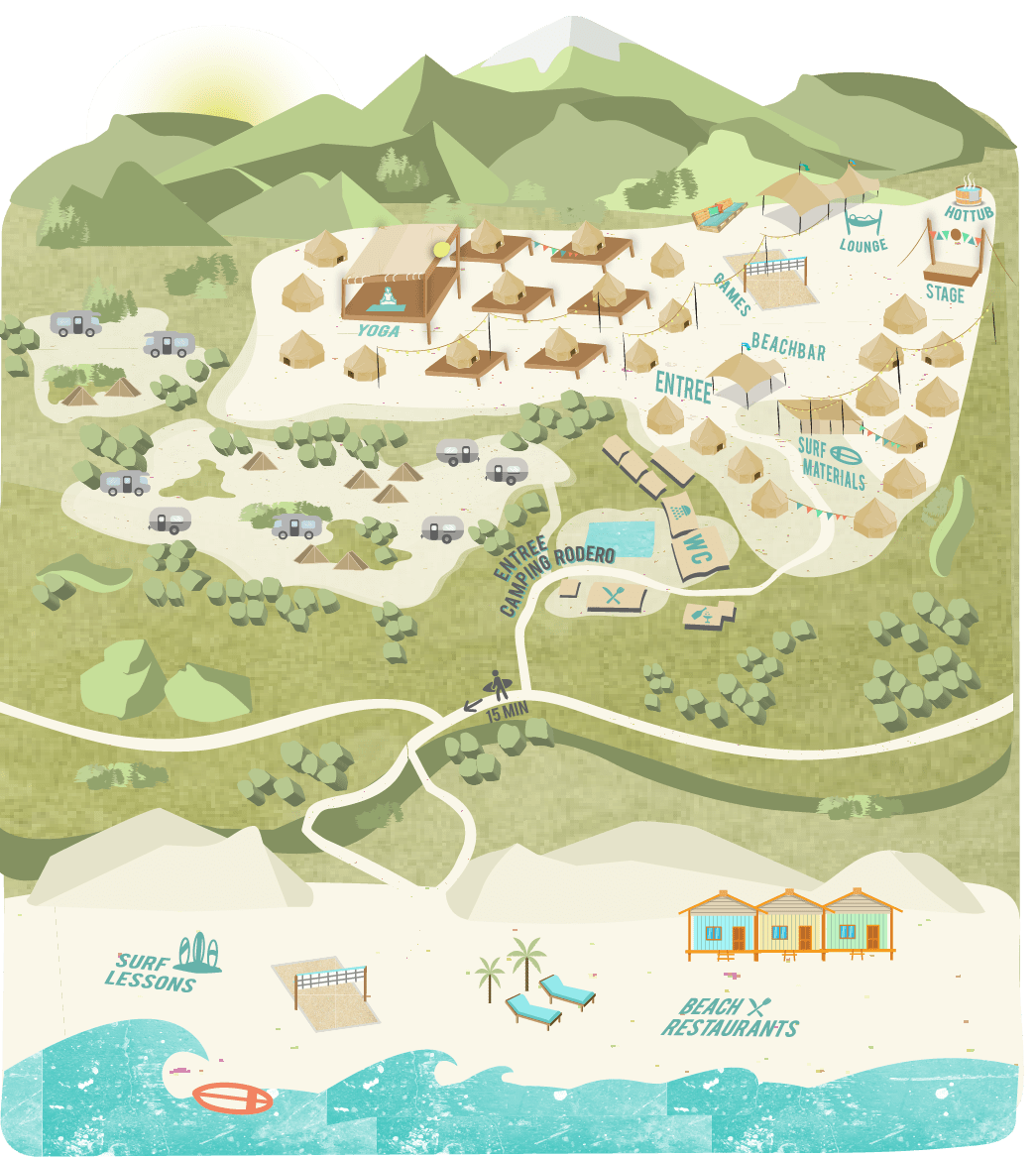 Het Enter The Wave terrein is gelegen in Oyambre, vlak aan de Atlantische oceaan, met uitzicht over de heuvels en de bergketen Picos de Europa. Het terrein ligt op korte loopafstand van de surfbaai playa Oyambre, zodat je binnen 15 minuten met je surfplank in het water ligt. De Enter The Wave deluxe tipi’s liggen om een gemeenschappelijk terrein met lounges, gezamenlijke tenten en onze surfbar. Lees hier alle tips over de omgeving!